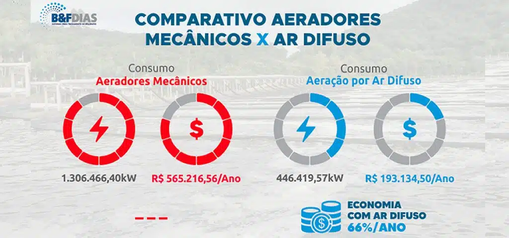 A aeração por ar difuso, substituindo tecnologias menos eficientes, bem como os aeradores superficiais, pode proporcionar economia de até 50%