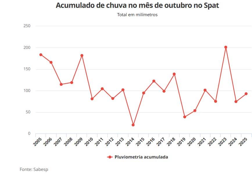 Contudo mesmo com a queda no volume do reservatório, em termos de chuvas, outubro de 2025 registrou aumento, com 92,7 milímetros, próximo à média histórica do mês, que é de 107,6 mm. Deste forma, o mês teve 86,2% do total esperado de chuva para o mês.