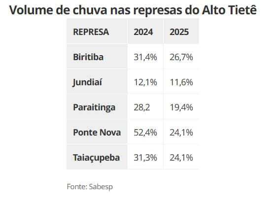 O número é bem inferior aos 41% registrados no mesmo período de 2024. O SPAT abastece cerca de 4 milhões de pessoas na zona leste de São Paulo e nos municípios da Região Metropolitana.