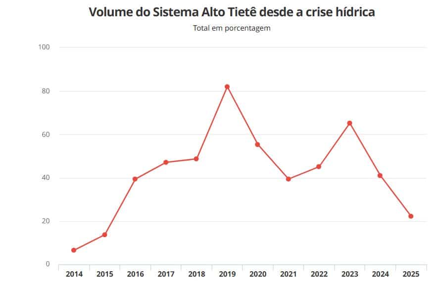O Sistema Produtor Alto Tietê (SPAT) registrou em outubro de 2025 o menor volume para o mês desde a crise hídrica de 2014-2015, operando com apenas 22,3% da capacidade, de acordo com os dados da Companhia de Saneamento Básico do Estado de São Paulo (Sabesp).