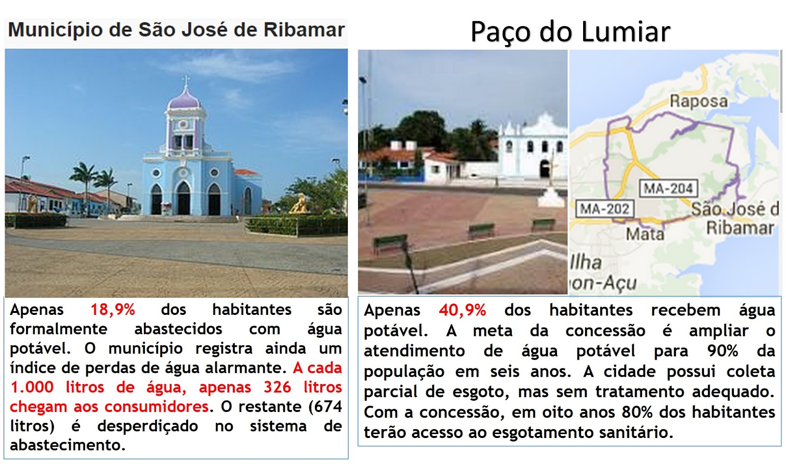 Pelos próximos 35 anos, a Odebrecht Ambiental é a concessionária responsável pelos serviços de água e esgoto de São José de Ribamar e Paço do Lumiar. Pelo acordo contratual firmado com os dois municípios, a empresa investirá mais de R$ 450 milhões, o que elevará os índices de abastecimento de água tratada e coleta e tratamento de esgoto das duas cidades.