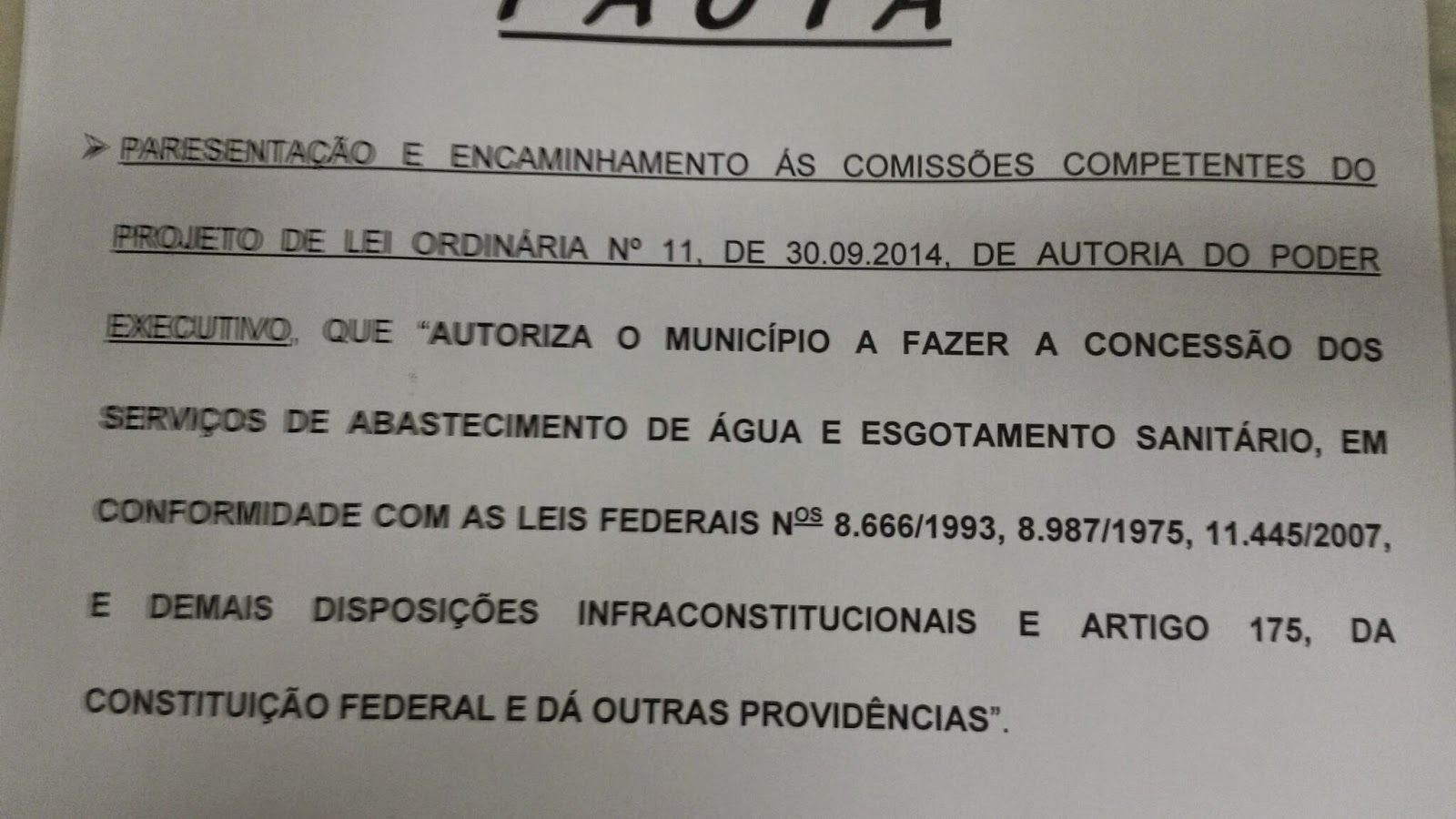 E apresentaram as comissão competentes do projeto de Lei n 11, de 30.09.2014, de autoria do poder executivo, que autor ir o município a fazer a concencessao dos serviços de abastecimento de água e esgotamento sanitário em conformidade com as leis federais.