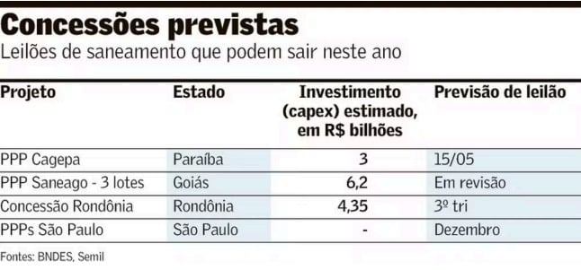 Em março, os dois leilões inicialmente previstos acabaram não se concretizando. A licitação de três PPPs da Saneago (estatal de Goiás) foi cancelada por falta de propostas – um grupo chegou a apresentar oferta por um dos três lotes, mas foi inabilitado. Já a concorrência da PPP da Cagepa (companhia estadual da Paraíba) foi remarcado para 15 de maio.
