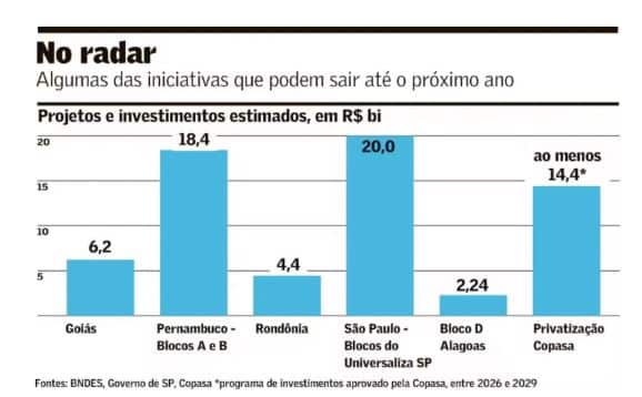 Em 2026, a expectativa é que diversos projetos venham ao mercado, segundo Lucas Sant’Anna, sócio do Machado Meyer Advogados. “Tem muita coisa por vir. Os Estados estão se organizando para fazer concessões e buscar o melhor modelo para seu ativo.” Além dos projetos de Pernambuco e da Copasa, ele cita oportunidades no Ceará, no Rio de Janeiro, em Goiás e no Espírito Santo, entre outros. “Não acredito que saia tudo, mas tem muitos estudos.”