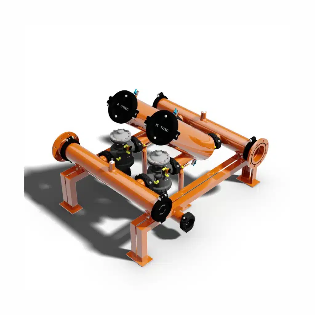 Os filtros de tela e manifolds são construídos em aço carbono A36, os acoplamentos e válvulas de 3 vias para retrolavagem são de alumínio, dando praticidade e versatilidade na montagem.